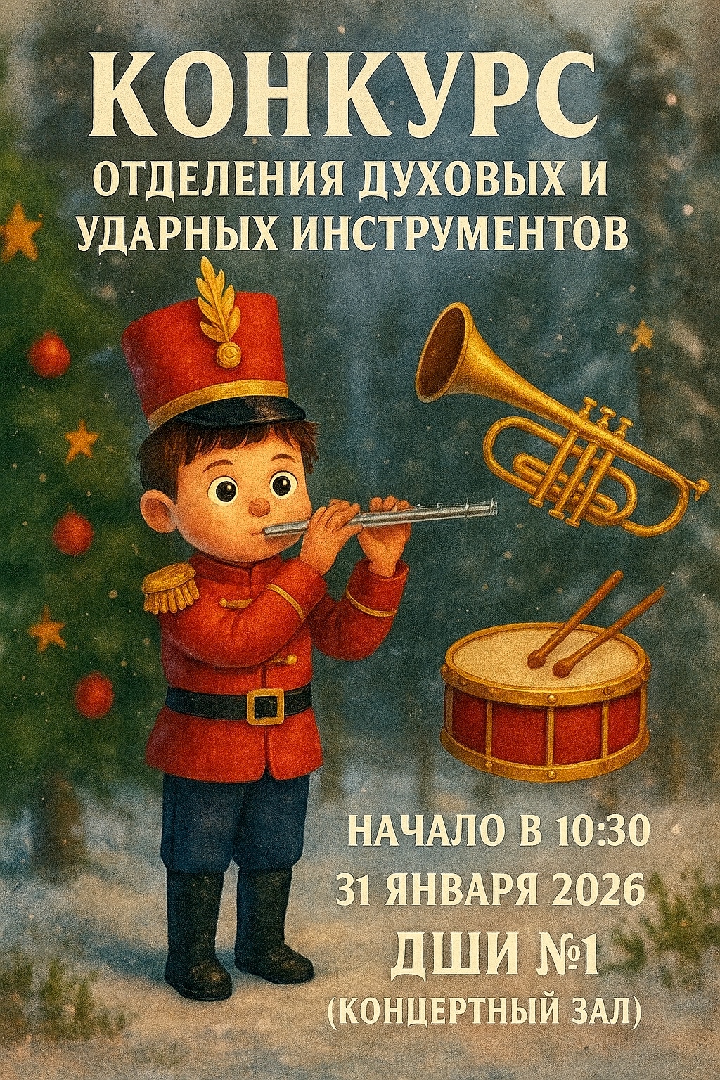 Яркий музыкальный конкурс учащихся отделения духовых и ударных инструментов! Юные музыканты продемонстрируют своё мастерство, артистизм и любовь к музыке, наполнив зал живым звучанием и праздничным настроением.