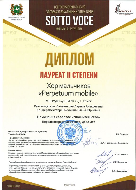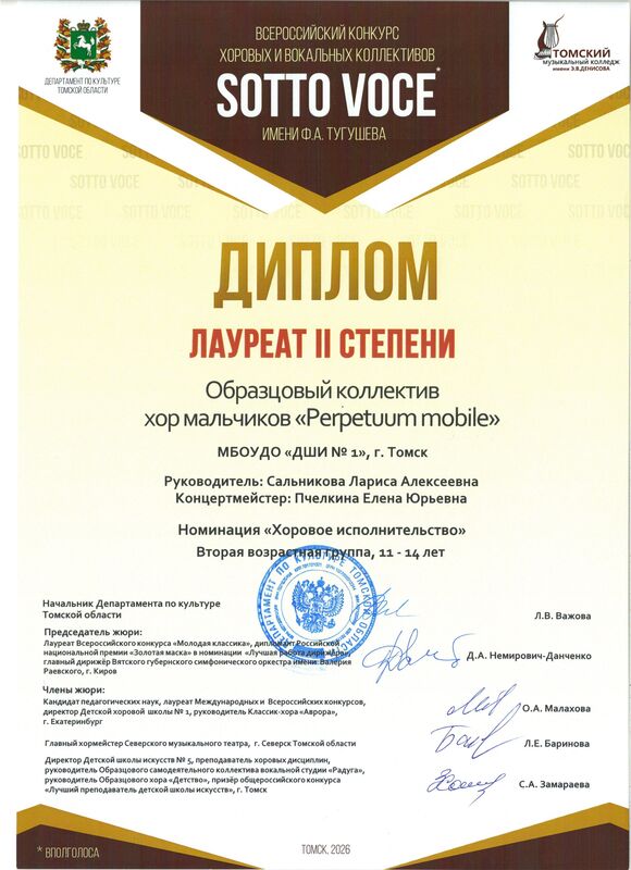 Концертмейстер — Пчёлкина Е.Ю. - Образцовый коллектив хор мальчиков «PERPETUUM MOBILE» (номинация «Хоровое исполнительство», первая возрастная группа) — Лауреат 2 степени