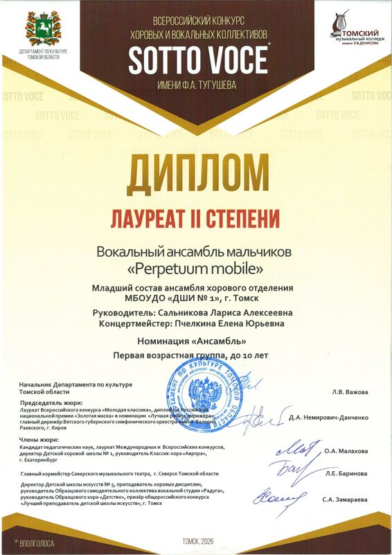 Концертмейстер — Пчёлкина Е.Ю. - Вокальный ансамбль хора мальчиков «PERPETUUM MOBILE» (номинация «Вокальный ансамбль», первая возрастная группа) — Лауреат 2 степени и специальный диплом «За эмоциональное исполнение»