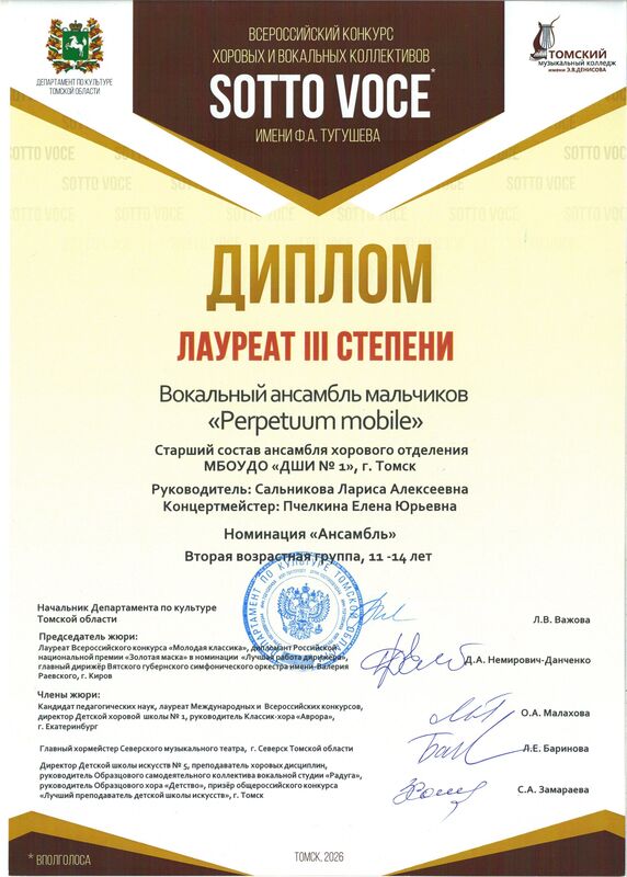 Концертмейстер — Пчёлкина Е.Ю. - Вокальный ансамбль хора мальчиков «PERPETUUM MOBILE» (номинация «Вокальный ансамбль», вторая возрастная группа) — Лауреат 3 степени