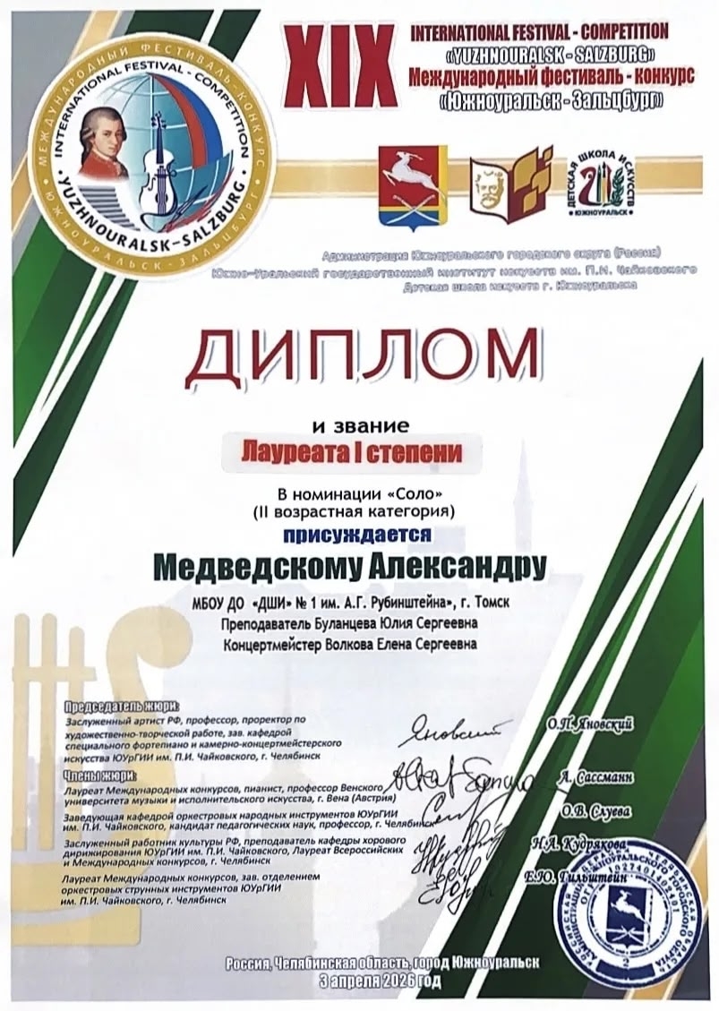 Медведский Александр стал Лауреатом I степени XIX Международного фестиваля-конкурса «Южноуральск – Зальцбург».